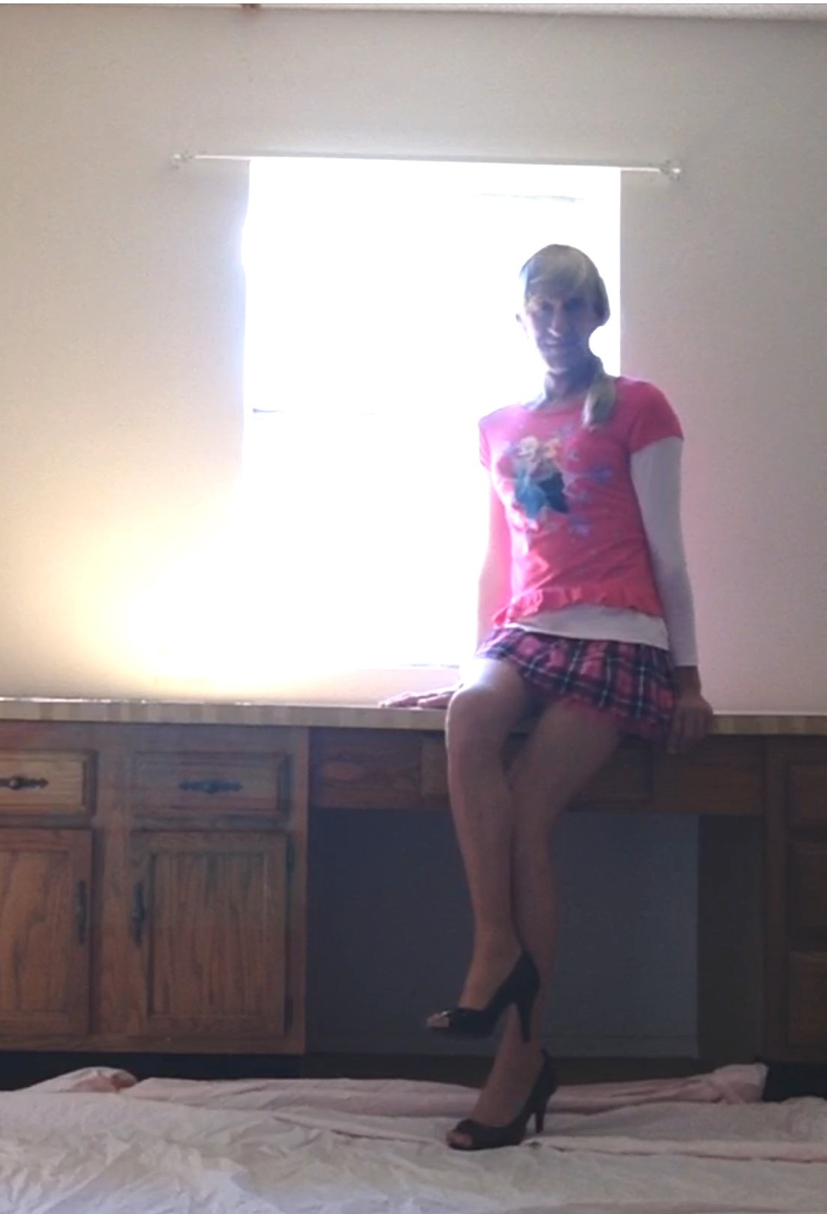 shemale karen wears a school girl skirt and heels